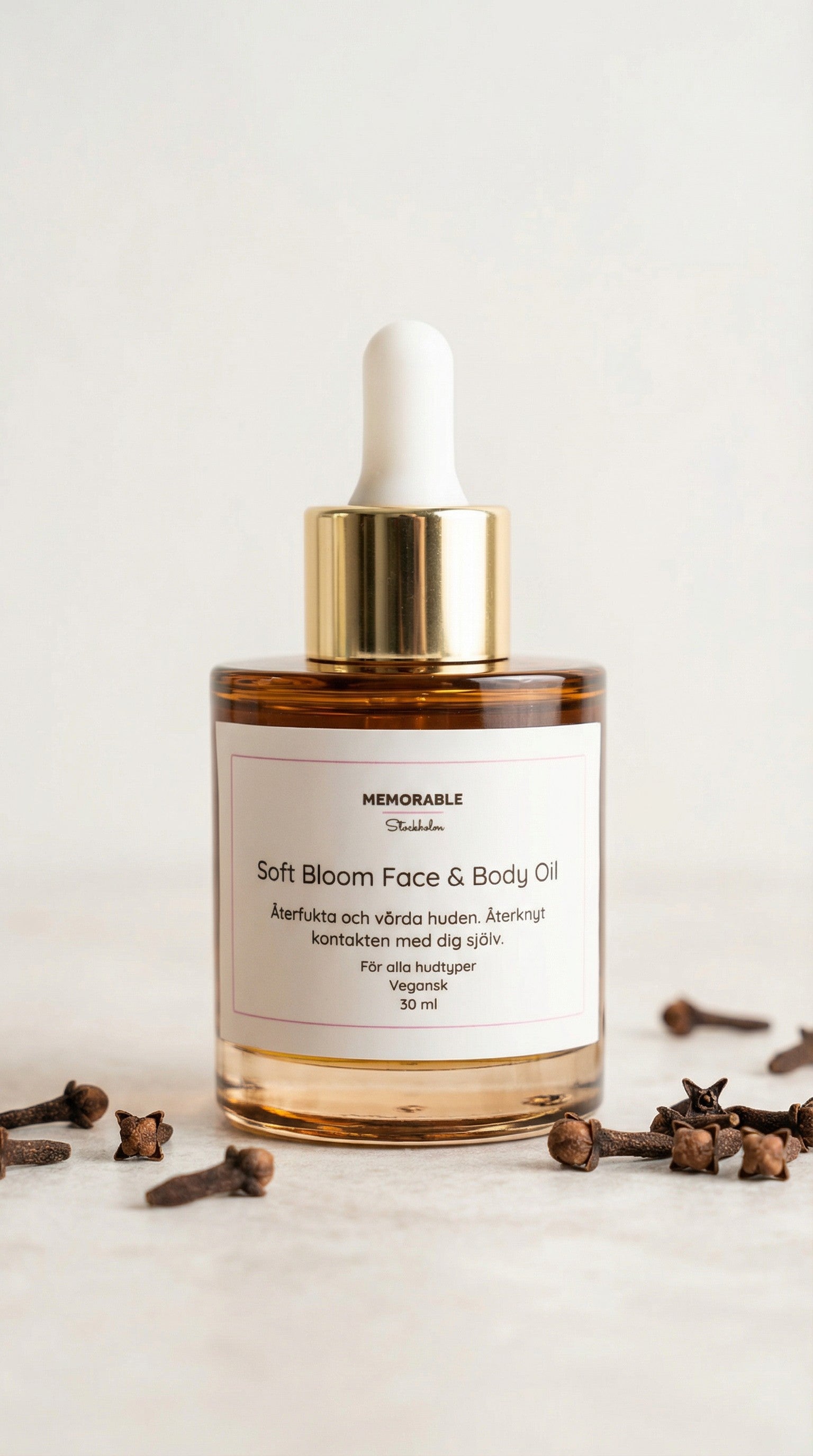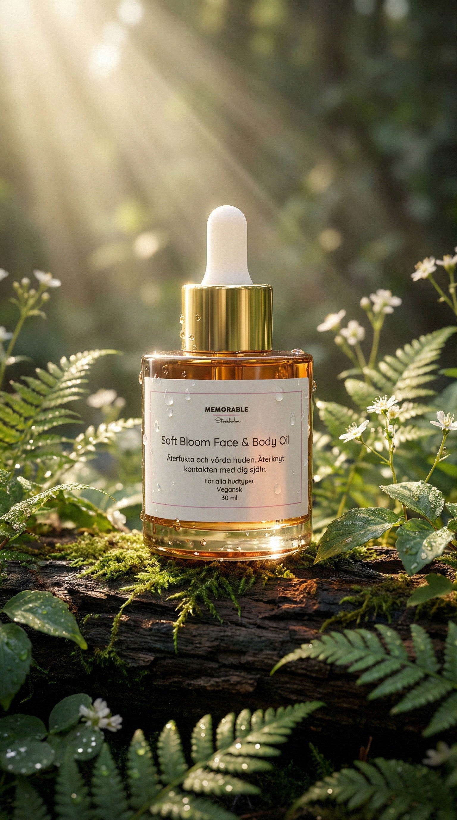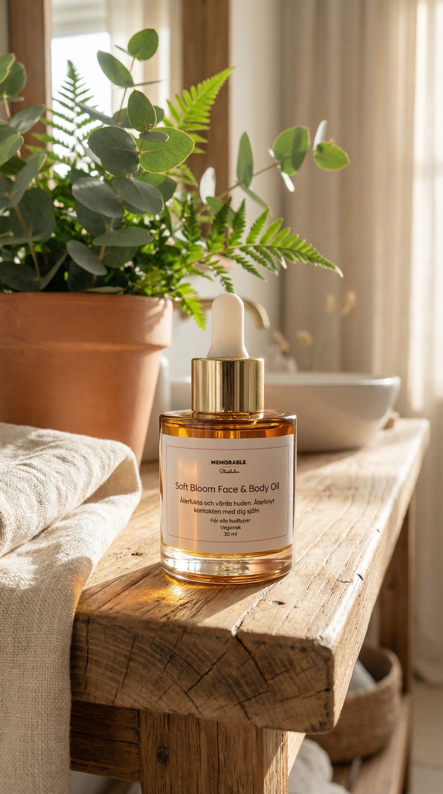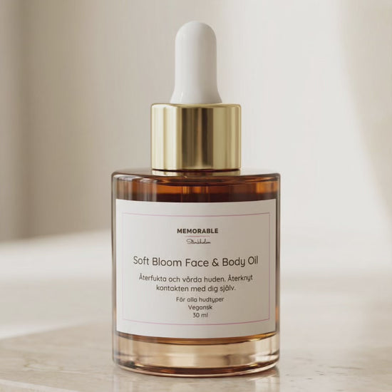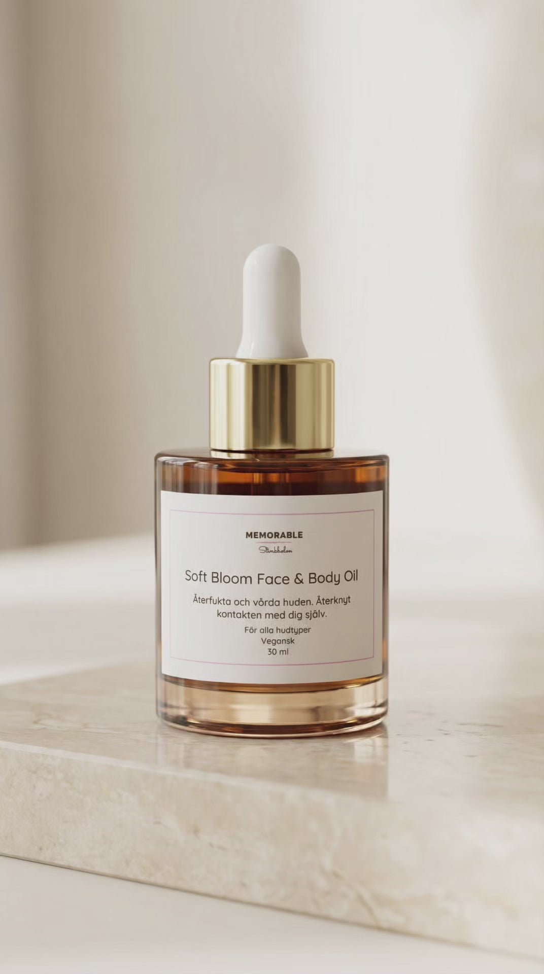 Soft Bloom Face & Body Oil är en näringsrik olja för ansikte och kropp som kan användas som serum under ansiktskräm eller på lätt fuktad hud efter dusch. Den ger huden en mjukt återfuktad och välvårdad känsla, med en naturlig och hälsosam lyster. Passar särskilt under torrare eller solfattiga perioder.